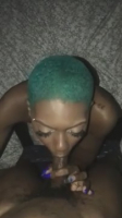 Сегодня у нас в гостях весьма необычная барышня - дело в том, что выглядит она весьма нестандартно - она чернокожая, но при этом ее волосы покрашены в зеленый цвет. Но даже такой странный выбор для самовыражения совершенно не мешает ей профессионально использовать навыки минета - напротив, парням такой нестандарт весьма нравится. И сегодня у нее в наличии такой длинный хуй, что напоминает палку кремлевской сырокопченой колбасы. И негритянка с легкостью заглатывает этот шнобель достаточно глубоко, а затем собирает сперму с него прямо горлом, в районе легких.