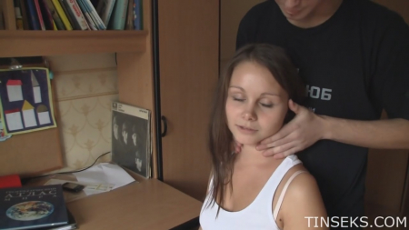 Не попытавшись разобраться в предмете, молодая девушка глазами отыскала телефон и набрала знакомому ботанику, который разбирается в предмете куда лучшее ее. Ленивая коза попросила его объяснить все досконально, но сама витает где-то в облаках, мечтая увидеть какающую радугой розового пони. Парнишка, с виду как целка в очках, предложил отложить книжки в сторонку, и сделать расслабляющий массаж для одноклассницы. Легкодоступная телка дала себя потрогать везде, а потом очнулась в советской кровати с этим "однолюбом" (так гласит его футболка). Господа, участникам данного мероприятия исполнилось 18 лет, хотя, на самом деле, это видно без дисклеймера.