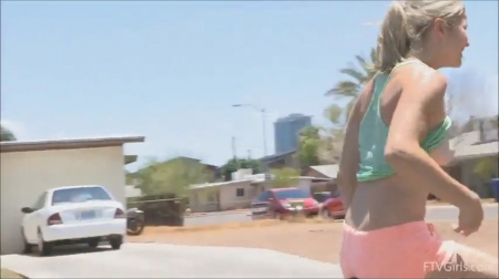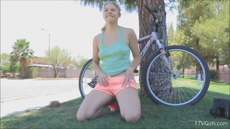 Подтянутая блондинка с коллекцией кед и кроссовок с раннего утра общается с оператором, пересказывая свой примерный день. Ее ножки в хорошей форме благодаря двухколесному другу, на котором девушка колесит по району, где знает каждый закоулок и деревце. Пока вокруг никого нет, эксгибиционистка приспускает короткие шортики и приподнимает маечку, показывая на ходу маленькие сиськи. Пришло время отдохнуть на траве под деревцем: телочка открутила сидушку и начала присаживаться на штырь велосипедного седла, вгоняя холодную железную трубку во влагалище, без презерватива, смочив слюной.