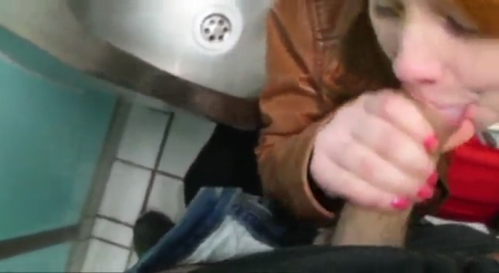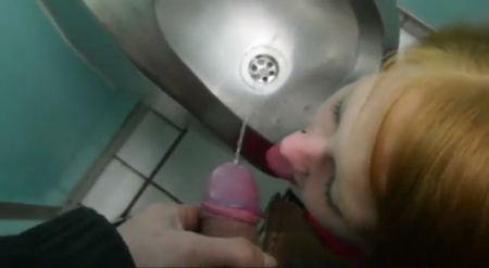 Лютая рыжая извращенка отправилась со своим бойфрендом в общественный сортир, который даже не имеет кабинок. Время позднее, сюда никто не зайдет. Она прямо в одежде села рядом с писсуаром и, когда ее приятель начал ссать в толчок, подставила язык для золотого дождя, отчего желтоватая жидкость перестала долетать до нужного места и пролилась на пол и рот девочки-сосочки. Следом она заглотила постепенно напрягшийся пенис, работая глоткой до максимума, отчего стала подкашливать и поперхнулась. Грязная хуесоска просто обожает подобные места, где, во-первых, есть страх спалиться, во-вторых, противно воняет и одно прикосновение к сортиру вызывает мурашки по коже с отвращением.