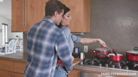 Жена разговаривает с мужем, а он не слушает. Мудень снова увлекся телефоном и окружающий мир полностью пропал для мужчины. На кухню пришел сынок, поздоровавшийся с мамой (она ответила) и с папой, до которого удалось достучаться со второй попытки. Сегодня мачеха максимально аппетитна, попка женщины притягательна для молодого человека, немудрено, что ему не удалось сдержаться. Подойдя к маме сзади, парень стал трогать в самых интимных местах, а получив ответную реакцию, разорвал штаны и принялся трахать мать при отце, который все так же ничего не замечал вокруг. После любовники переместились в спальню, где сделали грязные дела. Только батя крикнул из кухни и попросил бумажный полотенец, не видя обконченные сиськи супруги.