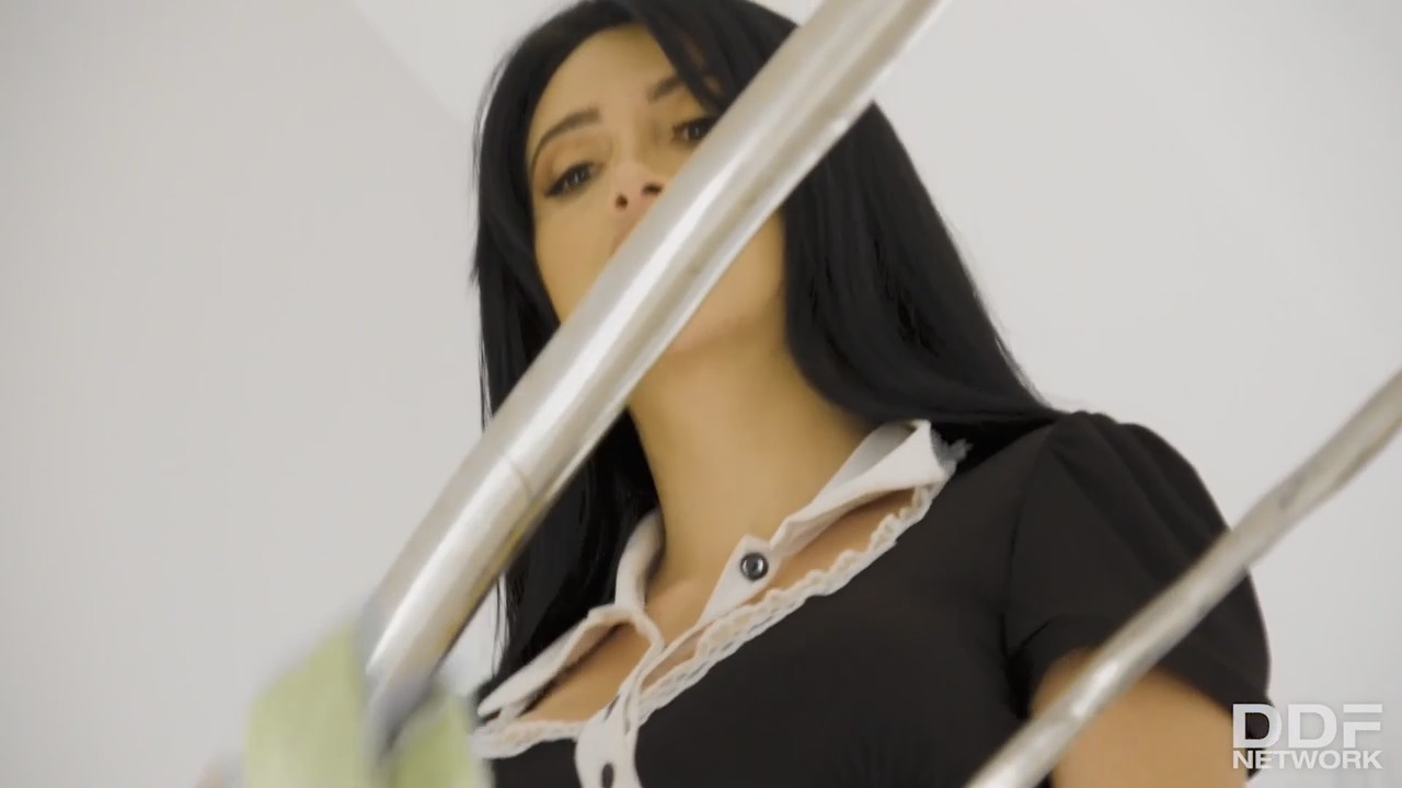 Большой светлый дом тяжело убирать в жаркую погоду, поэтому домработница приобрела коротенький костюм для работы. Она и без намеков понимала, что если убираться на лестнице, снизу будет все прекрасно видно, а может и специально подстрекала хозяина обратить внимание. Короткое предложение перепихнуться поступило буквально в этот же день, когда мужчина возвращался домой. Устоять перед горячей испанкой невыносимо, тогда он еще не подозревал о забавных темных сосках с большущей окружностью. Любовники не стали раздеваться, черный эро костюм только сильнее заводит состоятельного самца.