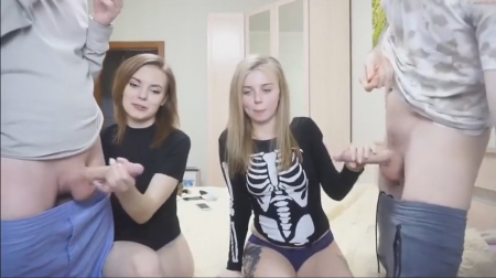 Вода под лежащий камень не течет, поэтому рано или поздно каждой девушке приходится изучать такой странный предмет, как основы минета. И по статистике чаще всего это делают первокурсницы-студентки, которые познают отдельную от родителей жизнь. В том числе и сексуальную естественно, набивая шишки на всем, чем дотянутся. Но эти блондиночки с подачи одногруппников решили запечатлеть свои первые оральные потуги, а их товарищи срубить немножко деньжат, поэтому сосать девахи начали в режиме онлайн и одновременно, почитывая советы из чата от комментаторов.