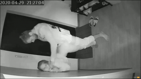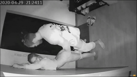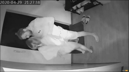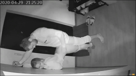 Стоило только супругу уснуть пьяным, к жене пришел сосед. Он здоровый бык и, если проснется рогоносец, сможет постоять за себя и за даму, которая присела отсосать желанному гостю. Совсем наглеть и проходить в комнату любовники не стали, занявшись сексом возле стены в коридоре, где снимают обувь. Девочка шикарно выгибает спину и она так довольна визитам друга, каждый день скучает, а со своим козлом забыла что есть адекватно потрахаться. Закончив дело, соседушка поцеловал изменщицу и побежал домой, ведь так-то он выходил покурить, домашние не поймут, ведь это двойная неверность. Все равно развод близок: последняя измена попала на скрытую камеру мужа.