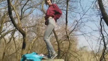 Романтический променад завел пару в лес. Птички вовсю щебечут, деревья скоро вновь станут зелеными, а солнышко уже печет плечи. Наверное, поэтому молодая худенькая особа сняла куртку и расстегнула клетчатую рубашку, показав словно детскую футболочку. Приспустившись на корточки перед спутником, она сразу взяла в рот уже совсем не вялого червячка. Деревенская соска знает, что здесь хорошее место и никто не ходит гулять, потому она не смотрит по сторонам когда наяривает писюкатого. Процесс настолько гладок, что бойфренд не заметил как спустил девчонке в ротик.