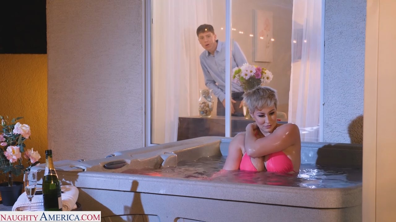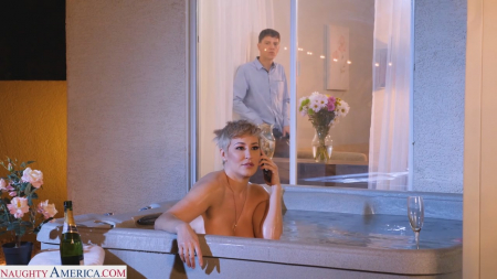 Короткостриженная дама залезла помыться в ванную, не ожидая сегодня больше никого увидеть в гостях. Сынок должен прийти позже обычного, потому можно расслабиться в компании вкусного шампанского и приятного мытья под открытым небом. Только всего этого не знал случайный гость, приехавший из коллежда попроведовать товарища, которого не было дома. Пройдя в гостиную, он заметил движение в окне. Там была та самая мамка другана, не заметившая паршивца за стеклом. Когда хозяйка вышла, наглец попытался убежать, но это тяжело с приспущенными штанами. Самка схватила пацана за перчик, заставив остаться чтобы дождаться ее сыночка.
