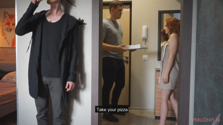 Проснувшись рано утром, подруга предложила бойфренду вкусно покушать пиццы. Денег у русской пары нет на нее, но рыженькой уже не впервой расплачиваться по-другому. Вот как раз подъехал здоровый курьер, услышавший про неимение денежек. Он собрался вызвать полицию по такому случаю, но девушка распахнула перед ним полотенец и он сразу усадил ее перед собой сосать. Щуплый хозяин квартиры встал возле стенки в соседней комнате и подглядывал в коридор за любимой телкой, которую стоя ебет другой. Verlonis18 еще могла его как-то видеть парня, а вот незнакомец - нет.