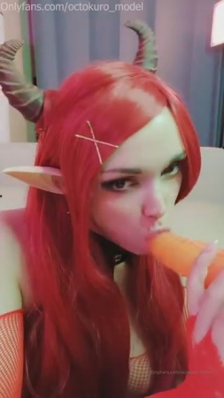Знаменитая косплеерша Октокуро покрасила волосы в красный цвет и прикупила для съемок сексуальный сетчатый костюм с корсетом и отличным доступом между ног к кормилице, которая приносит на анимешниках и подобных индивидах миллионы долларов изменившей свой вид пластической хирургией девушке. Слитое с онлифанса видео демонстрирует как грудастая демонесса, раздвинув ножки, мастурбирует уменьшенной копией драконьего пениса перед камерой мобильного телефона, поставленного вертикально. Шлюшка с рожками на голове под финал попыталась отыграть сильнейший оргазм от мастурбации.