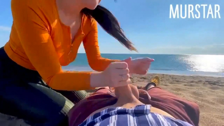 "Ну что, поиграем?" - поинтересовался голос за кадром у симпатичной молодой девушки в очках, которая вместе с бойфрендом пришла на пляж проветриться (в прямом смысле, тут ветер такой, что забивает микрофон камеры). Парнишка включил на телефоне интерактивный вибратор, вставленный в киску подружки. Она быстро возбудилась, сняла окуляры и принялась сосать, несмотря на то, что неподалеку загорают другие отдыхающие, а мимо ходит уборщик мусора, которому нет дела до странной парочки. Девчонка, немного пососав, начинает дрочить вялого до оргазма, сильно сжав в руке.