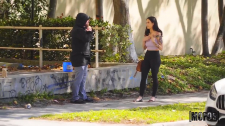 Любитель розыгрышей переоделся в бомжа и докопался до прохожего, чтобы тот отсыпал ему пару баксов. Забрав деньги в ведерко, чувак сел и залип в телефон, а благородная девица тоже собралась подкинуть ему денег, но он отказался, сославшись на то, что просто так модно одевается в тряпки и ему не нужны подачки, тем более в пяти метрах стоит его крутейший мерседес без крыши. Сняв верхнюю одежду и оставшись в рубашке, крутой папик посадил рядом незнакомку и повез ее кататься по городу, пока она ему сосет и дрочит. Нашлось укромное место на лице, где парень смог отъебать ведущуюся на тачки шалаву с отличной задницей, особенно когда ебешь ее раком.