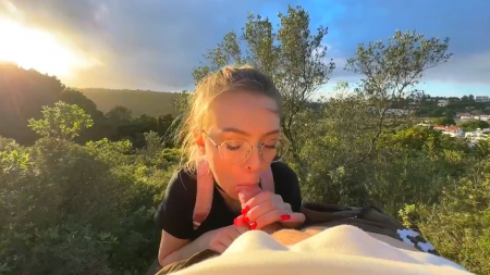 Красивая русская девчонка посреди зеленого холма делала минет своему молодому человеку. Глаза наслаждались ее личиком, его член наслаждался ротиком, все было прекрасно. Но тут за спиной подруги появились два силуэта, не особо смутившихся от увиденного и еще менее засмущалась сама делающая минет милашка, не переставшая сосать и не обернувшаяся на незнакомцев, спросивших можно ли подняться по холму еще выше, а второй просьбой стала фотография на мобильник. Им даже интересно стало, получилось ли запечатлеть сосущую и их на фоне одновременно. После этого незнакомцы ушли, а девочке кончили в рот, чтобы та выплюнула семя на землю.