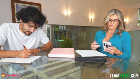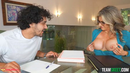 Мама залетает в комнату без стука, видя как ее пасынок мастурбирует под одеялом. Она просит поскорее подниматься с постели и идти учиться в свой выходной с ее бывшей одногруппницей - самой умной женщиной, которая только есть среди окружения. Действительно, сексапильная репетитор сидела с шикарным бюстом и давала примеры, чтобы мальчик их решал, но тот только и думал о своей учительнице и кругленьких сиськах рядом. Увидев их воочию, у него сразу все получилось и даже первый тест был сдан на четверку. Мамочка тоже вознаградила старающегося быть прилежным пасынка, отсосав его хуй в постели, когда тот очередной раз гонял шкурку. Перед следующим экзаменом репетитор Кори дала не только полюбоваться грудью, но и потрогать ее, а также дырочку между ног. Это побудило малого постараться пуще прежнего и вот он лежит довольный и голый в постели, дроча с закрытыми глазами, вспоминая последние события. Мама и ее подружка пугают своим появлением, но тут же успокаивают: пора мальчику насладиться сразу двумя кисками и четырьмя грудями.