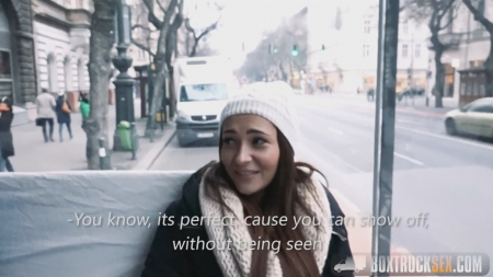 Мужчина с видеокамерой подошел к симпатичной телочке и завязал с ней непринужденную беседу, а потом предложил секс в необычном месте. Любопытство было сильно и девушка отправилась вместе с мужиком. Прозрачный куб (прицеп автомобиля) действительно стал не совсем обычным местом - ты видишь всех, находясь внутри, тебя никто не видит. Уже на месте незнакомец достал толстенную пачку денег и шлюшка готова стала на все, хоть для приличия еще немного и "поломалась".