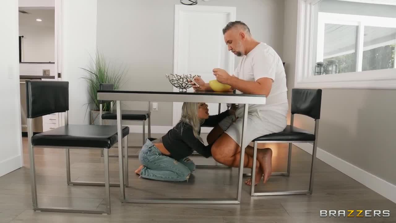 Красивая татуированная дева с очень большой силиконовой грудью не знала чем себя занять. Вдруг ей на глаза попался завтракающий супруг, но ему не было интересно ничего, кроме новостей спорта. Прямым текстом жена сказала, что хочет воспользоваться его большим хером в своих интересах, но тот снова никак не отреагировал. Тогда белокурая татуированная симпатяга залезла к нему под стол и начала сосать, но он доел и ушел поваляться. Тогда любимая включила погромче порнушку на телевизоре и не прошло и полгода, как он наконец-то дал использовать свой большой половой орган.