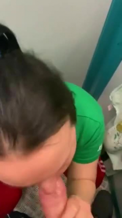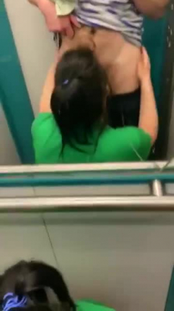 Парень со своей подругой заняли лифт в дневное время, когда все должны быть на работе для того, чтобы там как-то разнообразить совместную половую жизнь. Еще не дождавшись открытия дверей лифта, гопник уже достал свой член, а ведь внутри кто-то мог быть, но яйца уже бурлят и, когда парочка извращенцев заходит внутрь кабины, любовница тут же присаживается на корточки и начинает сосать его член, пока лифт не вызвала соседка с бутылками для воды, с которой все трое поехали до первого этажа, чтобы вновь нажать на верхний и потрахаться рачком лицом в зеркалу без зеленой футболки, а в конце надрочить пышную влажную пизду рукой.