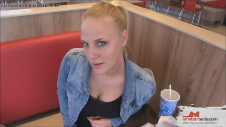 Молодые любовники любят экстремальный секс. А потрахаться где-нибудь в общественном месте как раз является одним из разновидностей этого секса. Парень, допустим, снимает на камеру как очаровательная девушка ест картошку фри и бургер (а вы знали что есть подобные вещи можно очень сексуально?). Но это не все, что было снято на камеру. После еды милашка достала из сумочки небольшой розовый вибратор и оттрахала себя им. От увиденной картины возбудился и молодой человек, поэтому парочка проследовала в туалет, где мужчина получил потрясающий минет, а девушка горячий ствол в свою дырку.