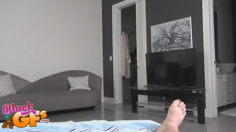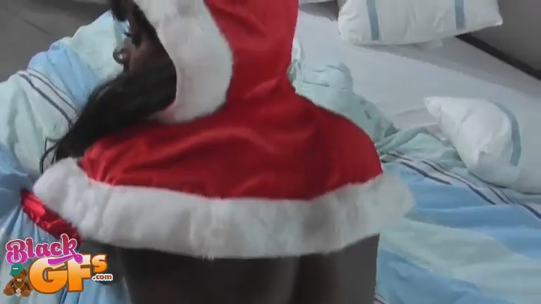 Молодой мужчина делает комплименты сногсшибательной любовнице и абсолютно не льстит - точенная фигурка с аппетитными формами и правда вызывает восхищение. Чернокожая бестия от комплиментов совсем "растаяла" и выполнила просьбу друга - надела костюм снегурочки. Хотя милашка надела лишь некоторые его части - сапожки, рукавицы и накидку - зрелище было бесподобным. Любой бы возжелал такую прелесть, но досталась она белокожему любовнику. После отличного минета девушка села своей узенькой дырочкой на твердый фаллос и довела себя и мужчину до оргазма.