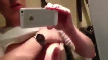 Девушка с большой грудью и айфоном снимает себя в зеркале поезда. Она мнет свою грудь и постепенно подбирается к своей киске