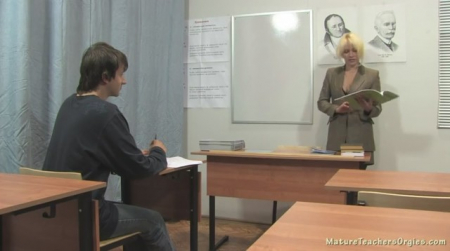 Зря преподавательница надела сексапильные чулки, ох как зря. Последний оставшийся студент, который по интеллекту недалеко ушел от городского батона, сидел прямо перед женщиной и смотрел на ее зону бикини. Ни одна теорема и правила не давались ему, и натягивать ему оценку до тройки - просто уголовное преступление с точки зрения морали. Поэтому она уже не зная, что делать, достала азбуку и стала спрашивать, как пишутся буквы. Поняв, что он настолько туп, что с трудом может и это, она решила просто заняться с ним сексом, чтобы окончательно не портить себе настроение.