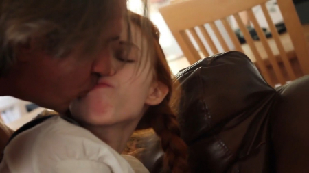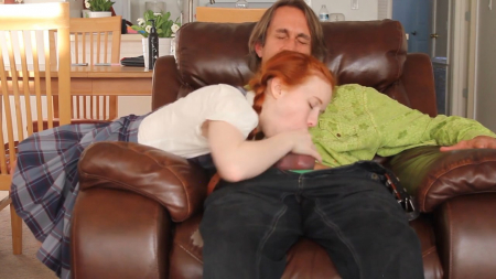 Юная рыжая девчонка мастурбировала в коричневом кресле. Но неожиданно в комнату зашел отец девушки и увидел дочь за столь интимными действиями. Папа наказал дочь за мастурбацию - он оттрахал симпатягу в пилотку, но сначала полизал ей.